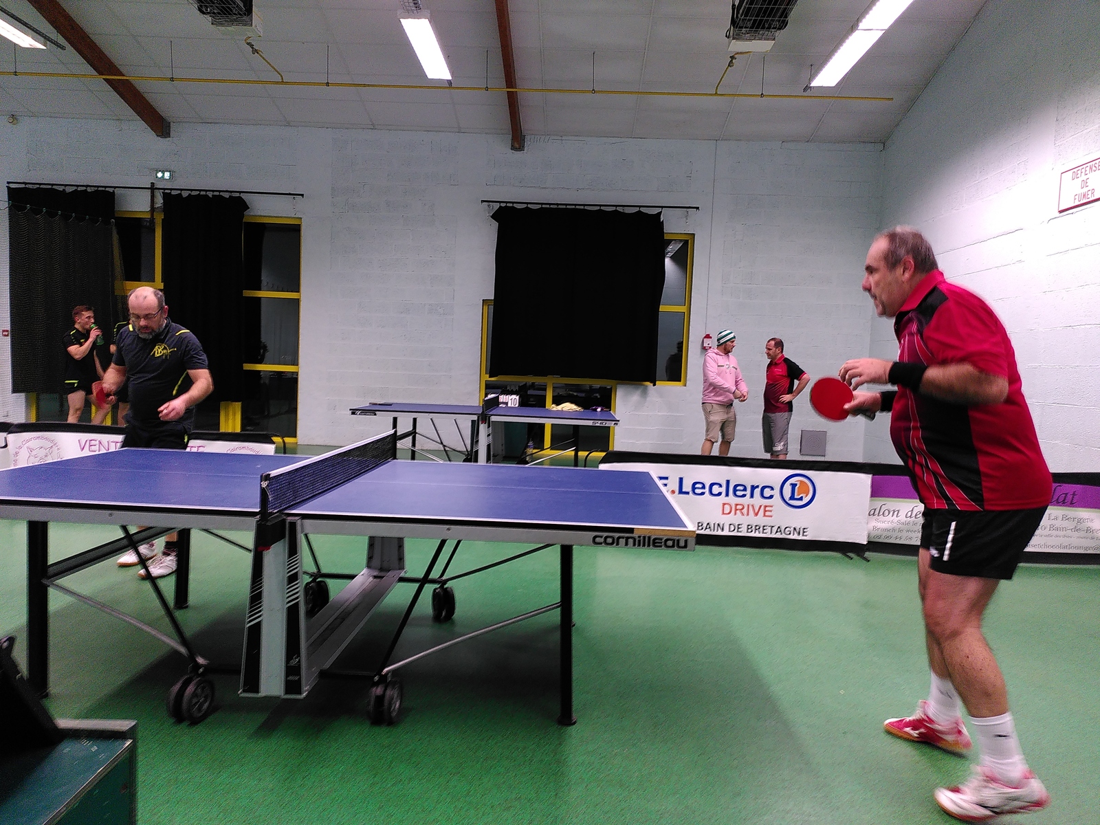 La salle est bien chauffée (appréciable par 0°C) mais les locaux ne sont pas sûrs de pouvoir arrêter le chauffage (soufflant depuis le dessus). Il va finalement s'arrêter après la phase d'échauffement. On prend un peu de retard au lancement car nous demandons s'il est possible de changer l'une des 2 tables, dont le filet est complètement relâché et sans fil pour le tendre. Après un petit quart d'heure de test de matériel, on peut démarrer.