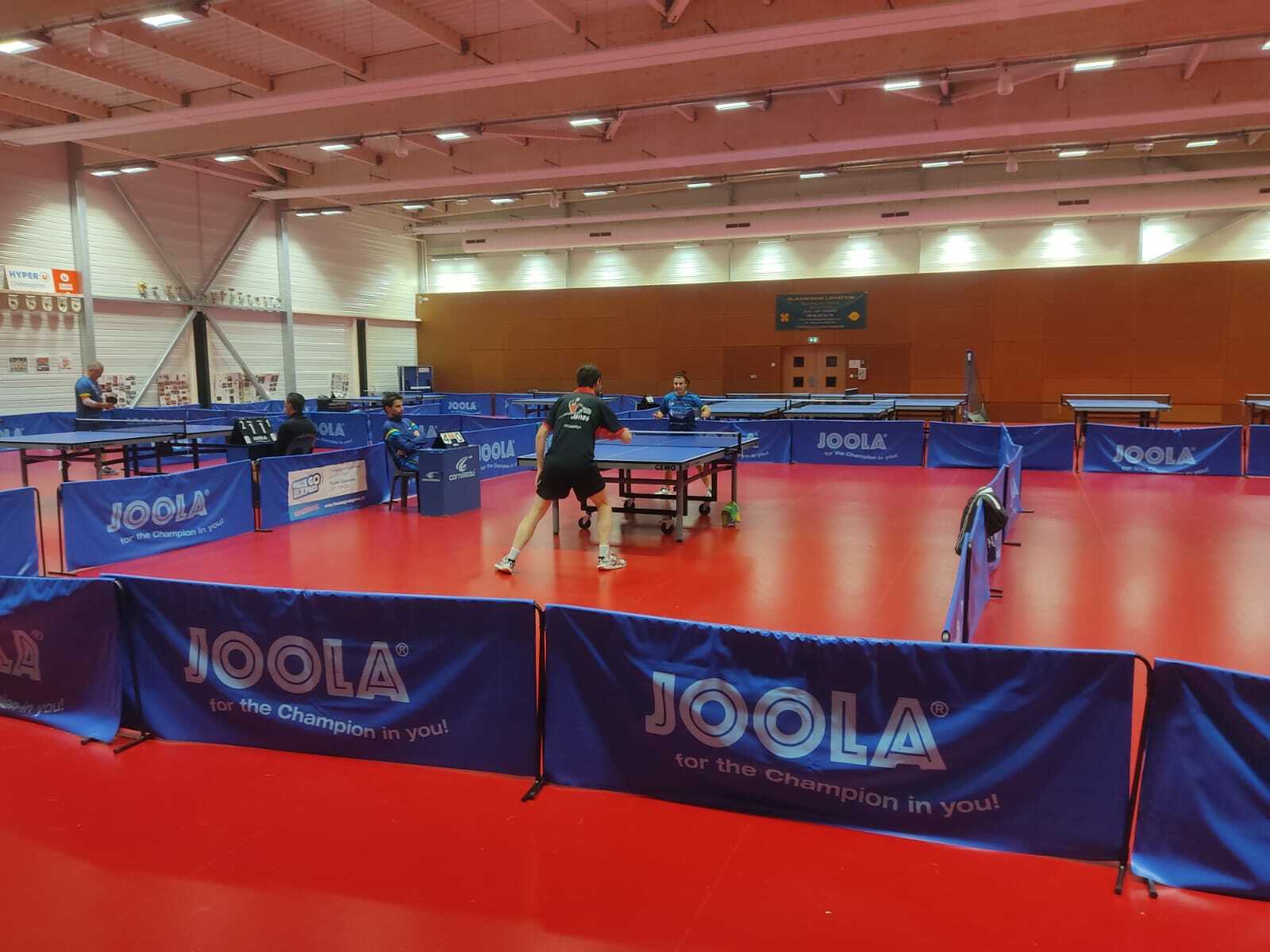 Marc essaie de se relancer face à Aurélien, mais celui-ci n'est pas gêné par son schéma de jeu et déroule ses coups offensifs. Comme lors de son premier match, Marc va réussir à décrocher le 3e set 12-10, mais c'est tout. Frustrant, mais il y avait du niveau en face... Anthony et Sandrine se sont déjà croisés sur le circuit, et le premier a l'avantage psychologique. Le match va être néanmoins serré, avec un léger avantage au janzéen qui "sait comment faire" et a des solutions tactiques. Après un set gagné de chaque côté, la victoire 12-10 d'Anthony dans le 3e set va faire la différence, et Anthony va conclure au 4e. Antony est opposé à son tour au mystérieux Vincent, et va réussir à mener 2-0. Mais le vernois se rebelle et égalise à 2-2. Aucun des sets n'a été vraiment serré, tout va se jouer à la belle et celle-ci va être remportée par Vincent 12-10. Une belle perf pour lui, et une confirmation que les 873 points sont suspects. Laurent prend rapidement le dessus face à Allan qui exprime clairement son mécontentement sur sa qualité de jeu. Mais le vernois se reconcentre dans le 3e set qu'il remporte aisément. Laurent en remet une couche au 4e et reprend vite le dessus. Le mental était côté Janzé. Et cette victoire permet à Janzé de conserver son avance : 5-3 avant les doubles ! Nous sommes sur les rails pour la traditionnelle victoire 8-6 sur les matchs à enjeu !